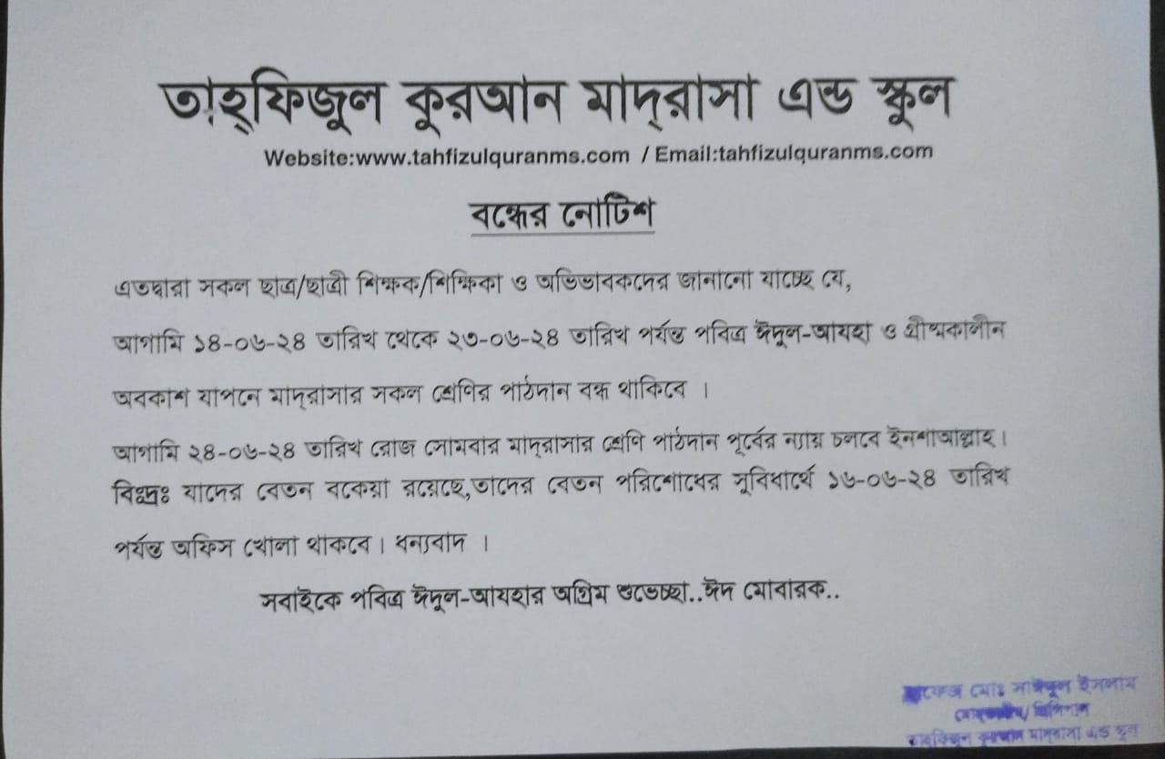 | 2 | পবিত্র ঈদুল আযহা উপলক্ষে আগামী ১৪ /০৬ /২৪ তারিখ থেকে ২৩ / ০৬ /২৪ তারিখ পর্যন্ত মাদরাসার সকল শ্রেণির পাঠদান বন্ধ থাকিবে। |